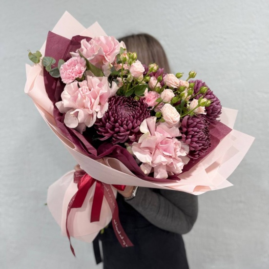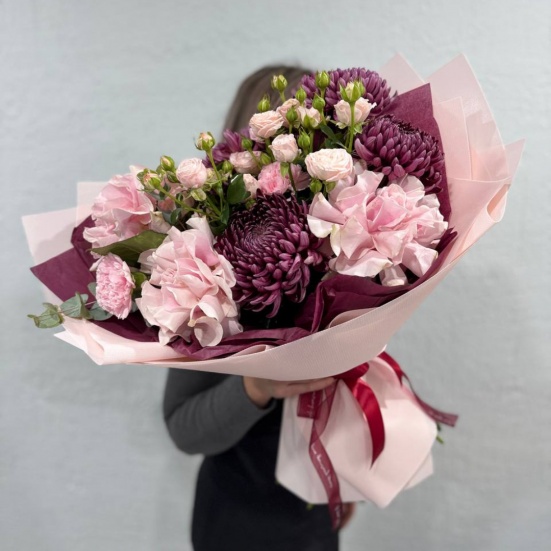 Авторский букет с бигуди-хризантемой, французскими розовыми розами, кустовыми розами и диантусами в Мурманске