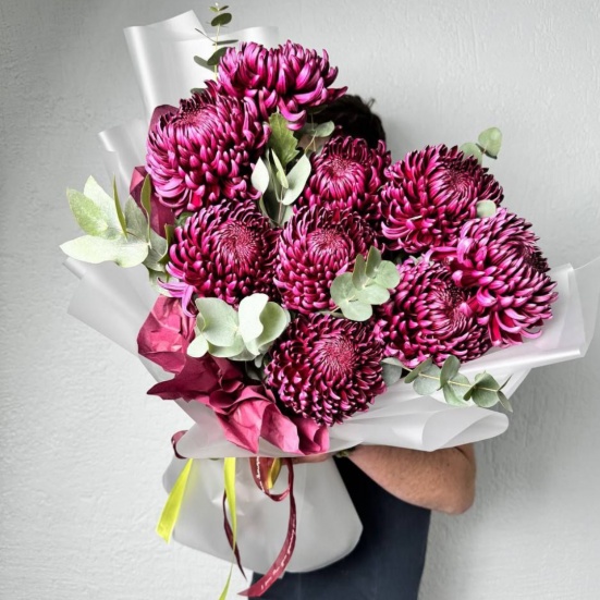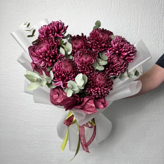 Выразительный моно букет из сезонной стойкой хризантемы "Бигуди" и эвкалипта